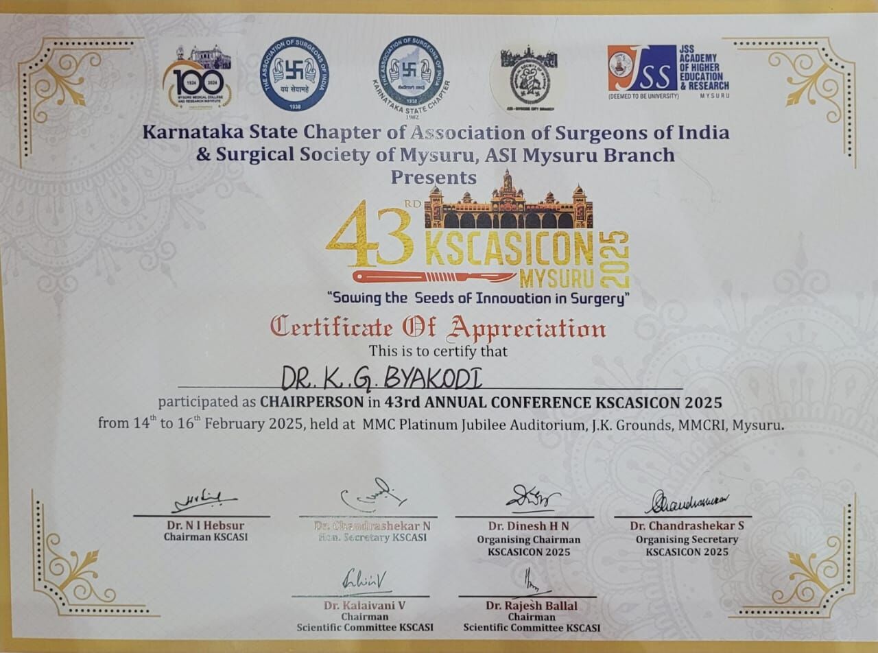 Beyond his clinical expertise, Dr. Byakodi is actively involved in surgical education as an Associate Professor at KIMS, Hubli, mentoring future surgeons and contributing to medical research. He has organized several state-level conferences, served as an executive member of Karnataka State ASI, and holds key positions in various professional organizations. Known for his precision, patient-centric approach, and commitment to innovation, he continues to be a trusted name for advanced surgical care in Hubli-Dharwad. If you seek expert consultation for laparoscopic or cancer surgery, Dr. Byakodi’s expertise ensures the highest standards of treatment with faster recovery and optimal outcomes